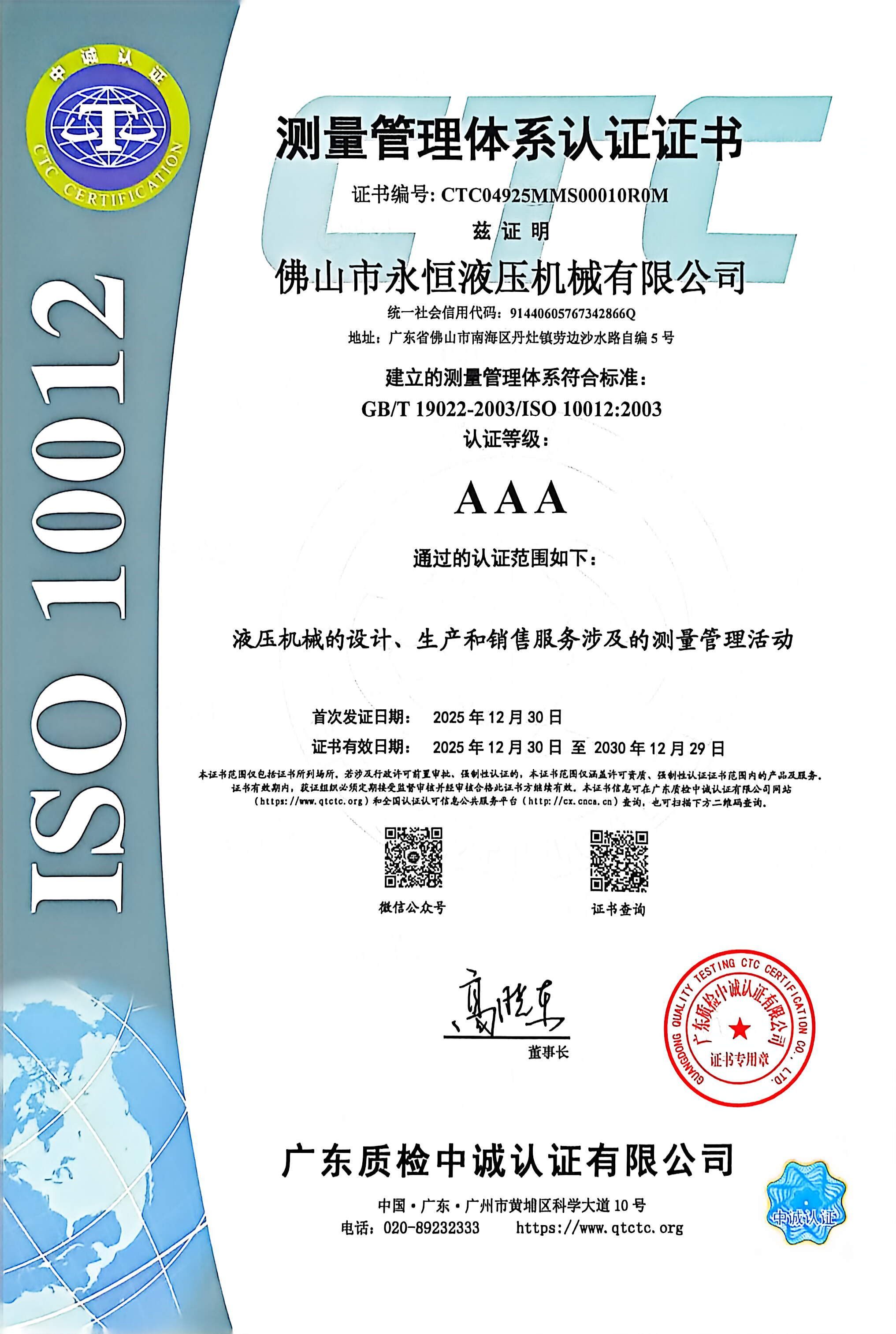 測(cè)量管理體系認(rèn)證證書(shū)
